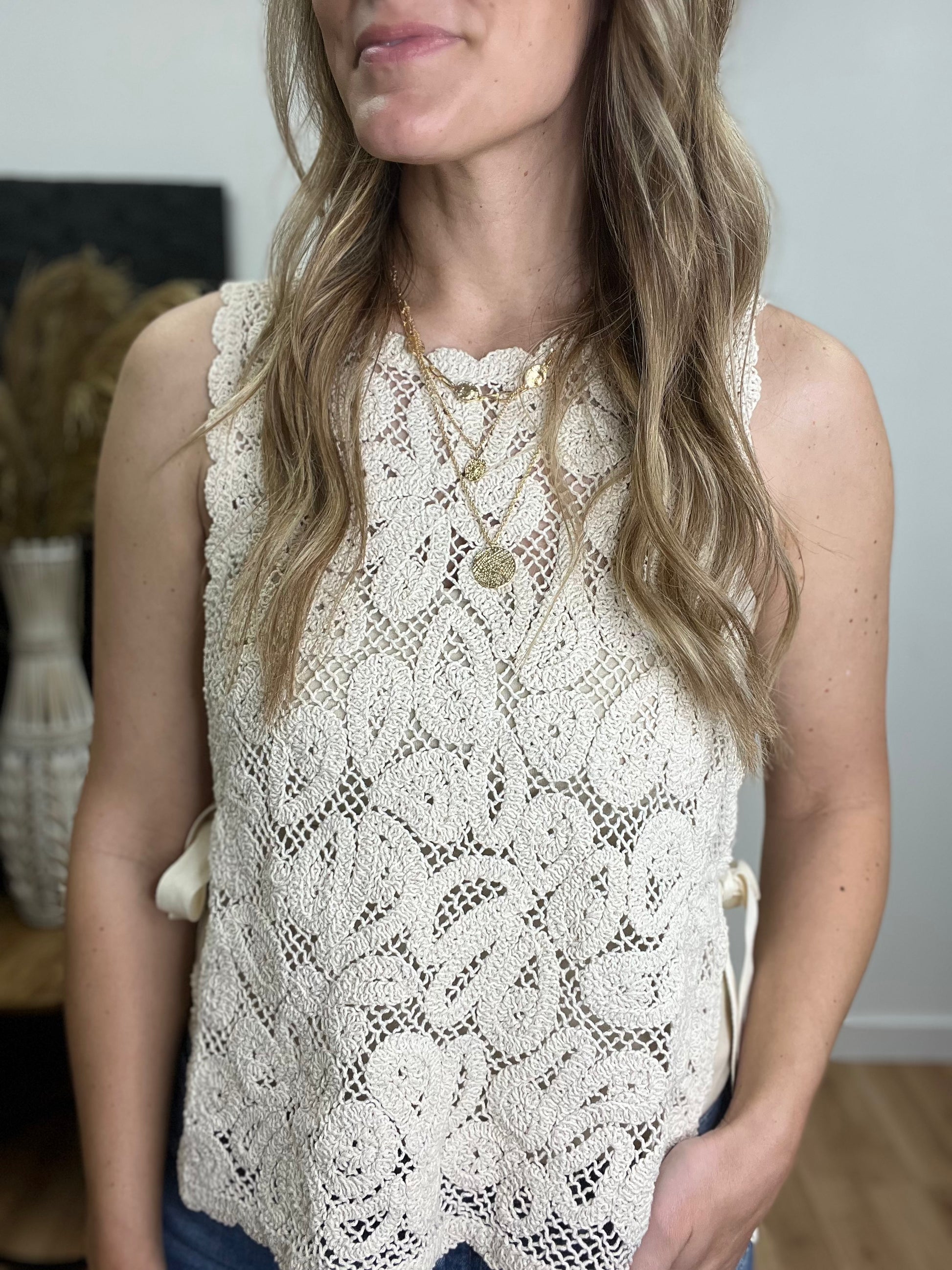 Delicate meets boho in this Floral Crochet Vest Top, crafted in a neutral tone for effortless layering. Featuring intricate floral crochet detailing and open sides, this airy piece adds texture and charm to any outfit. Twill tape ties on each side offer an adjustable fit. Whether styled over a bralette, tank, or flowy dress, this vest brings a breezy, feminine edge to your warm-weather wardrobe.