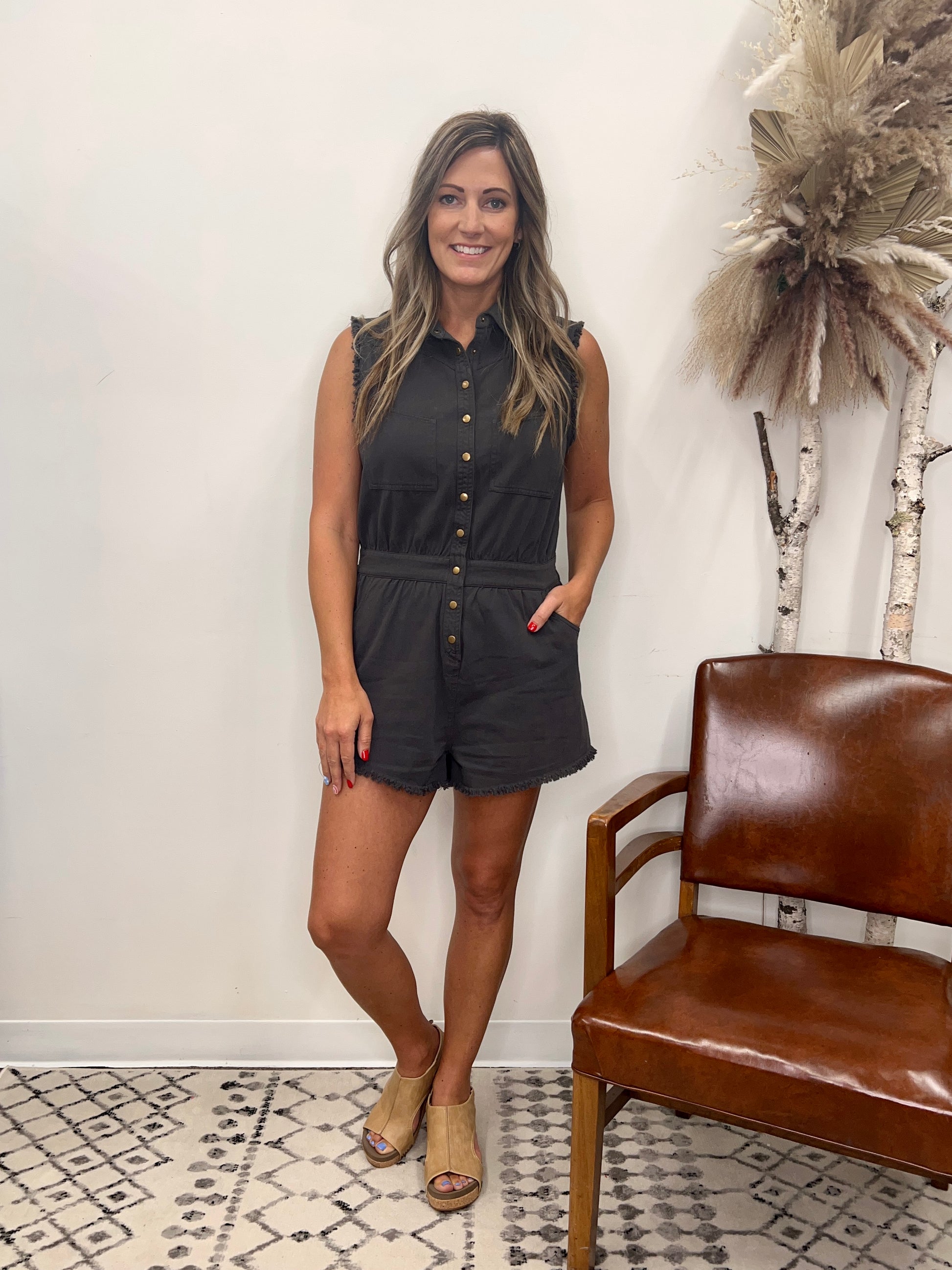 Denim Romper With Raw Hem Detailing And Button Front. Non Stretch. Featuring Breast Pocket Detail And Front Pockets.