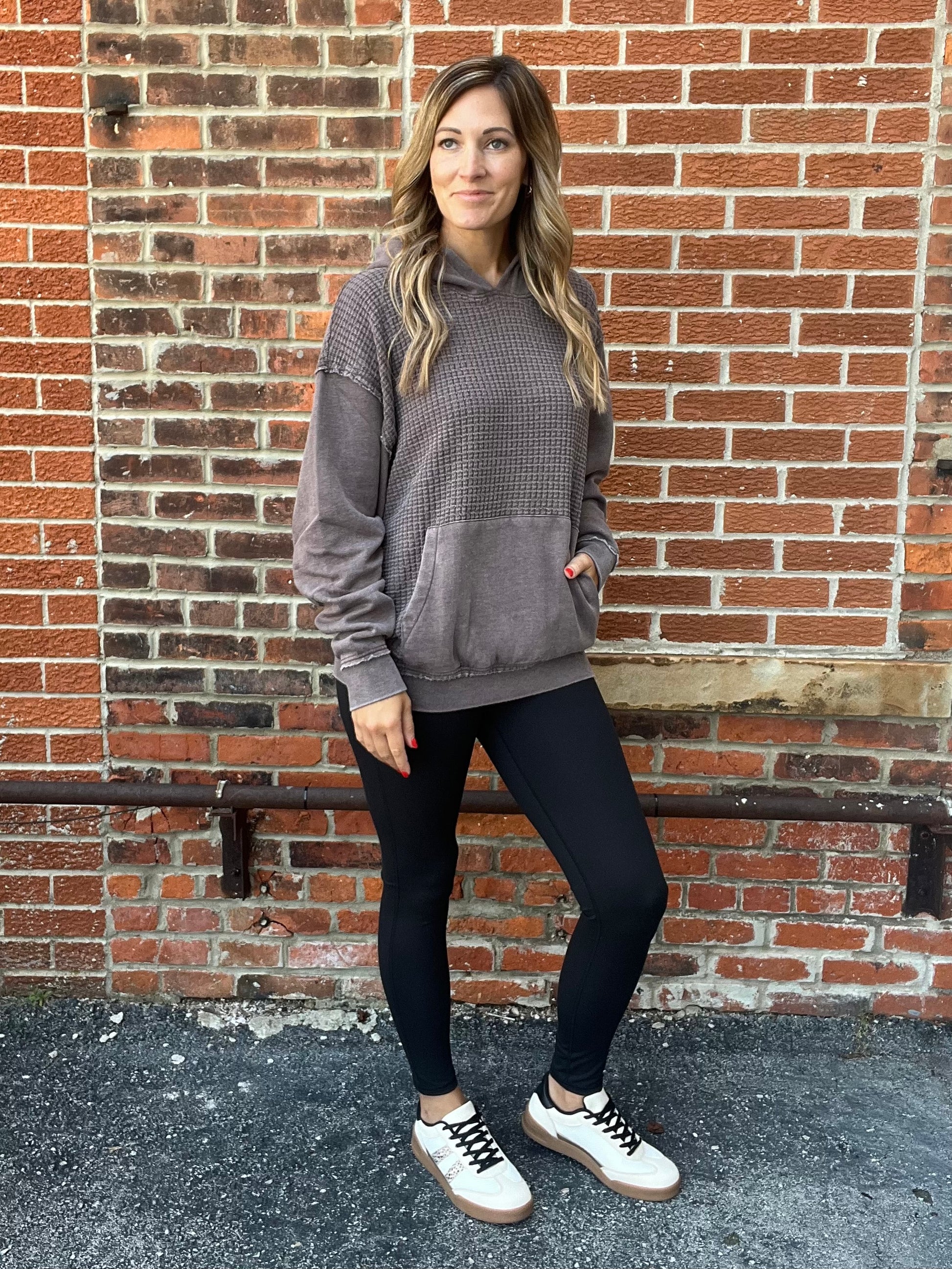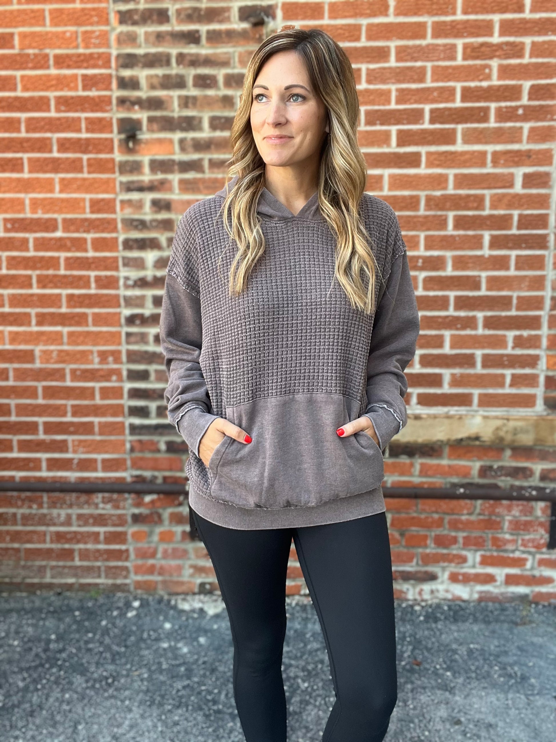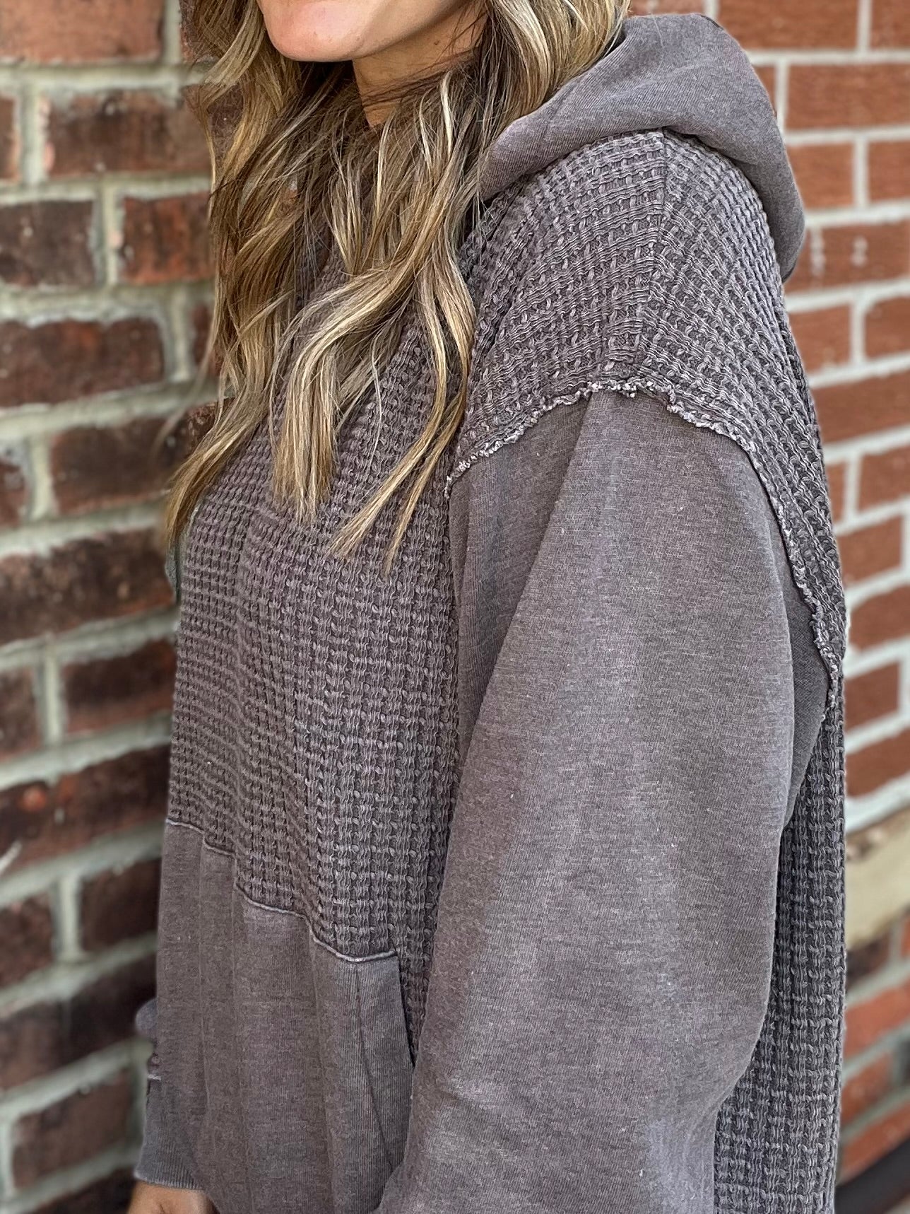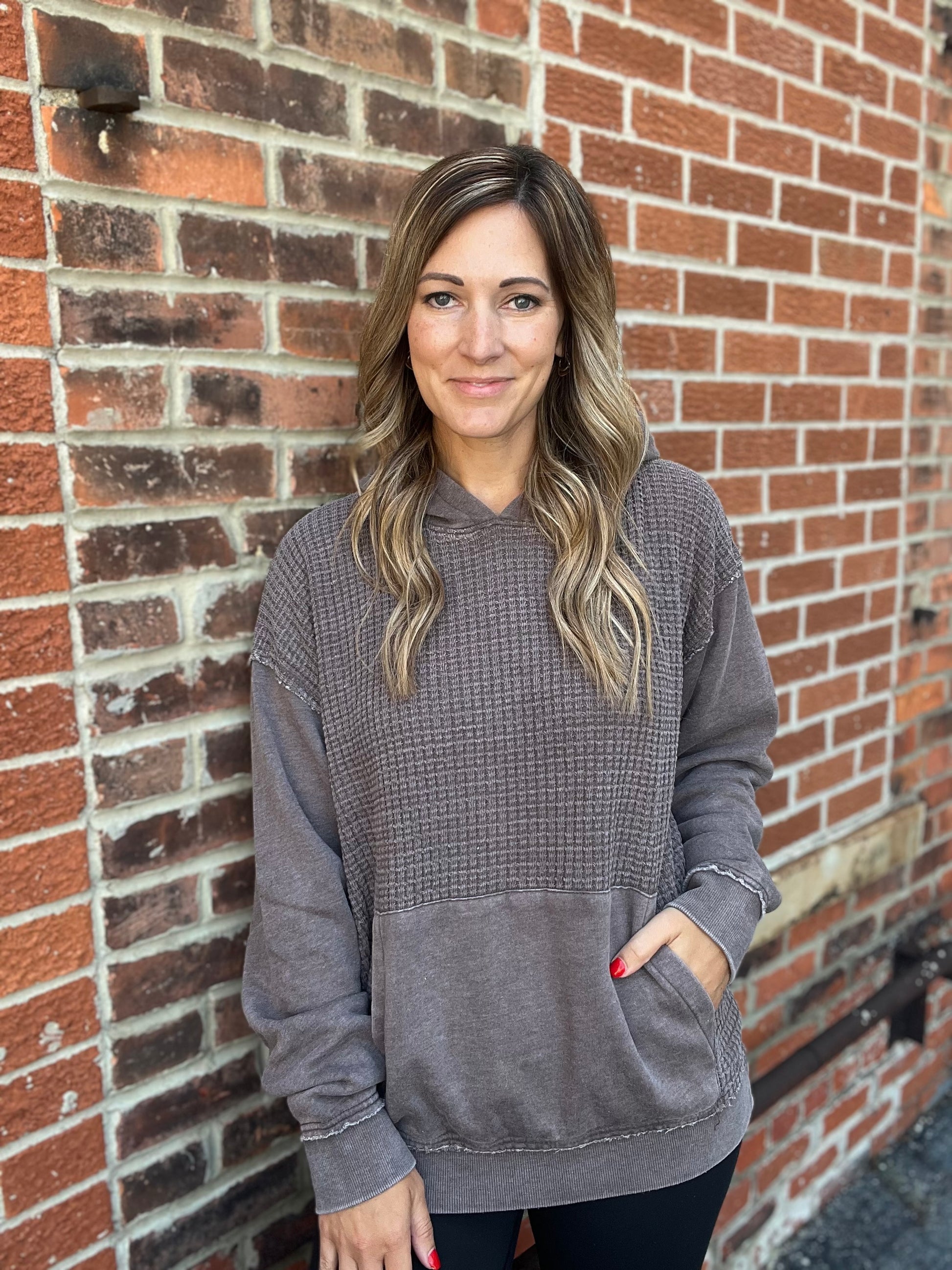 Cozy and casual, this espresso colored hoodie features a textured waffle knit body for that perfect laid back vibe. The hood and sleeves are made from a smooth, non waffle fabric for a soft contrast in texture. Finished with a classic front pocket and relaxed fit, it’s the ideal throw on and go piece for any season.