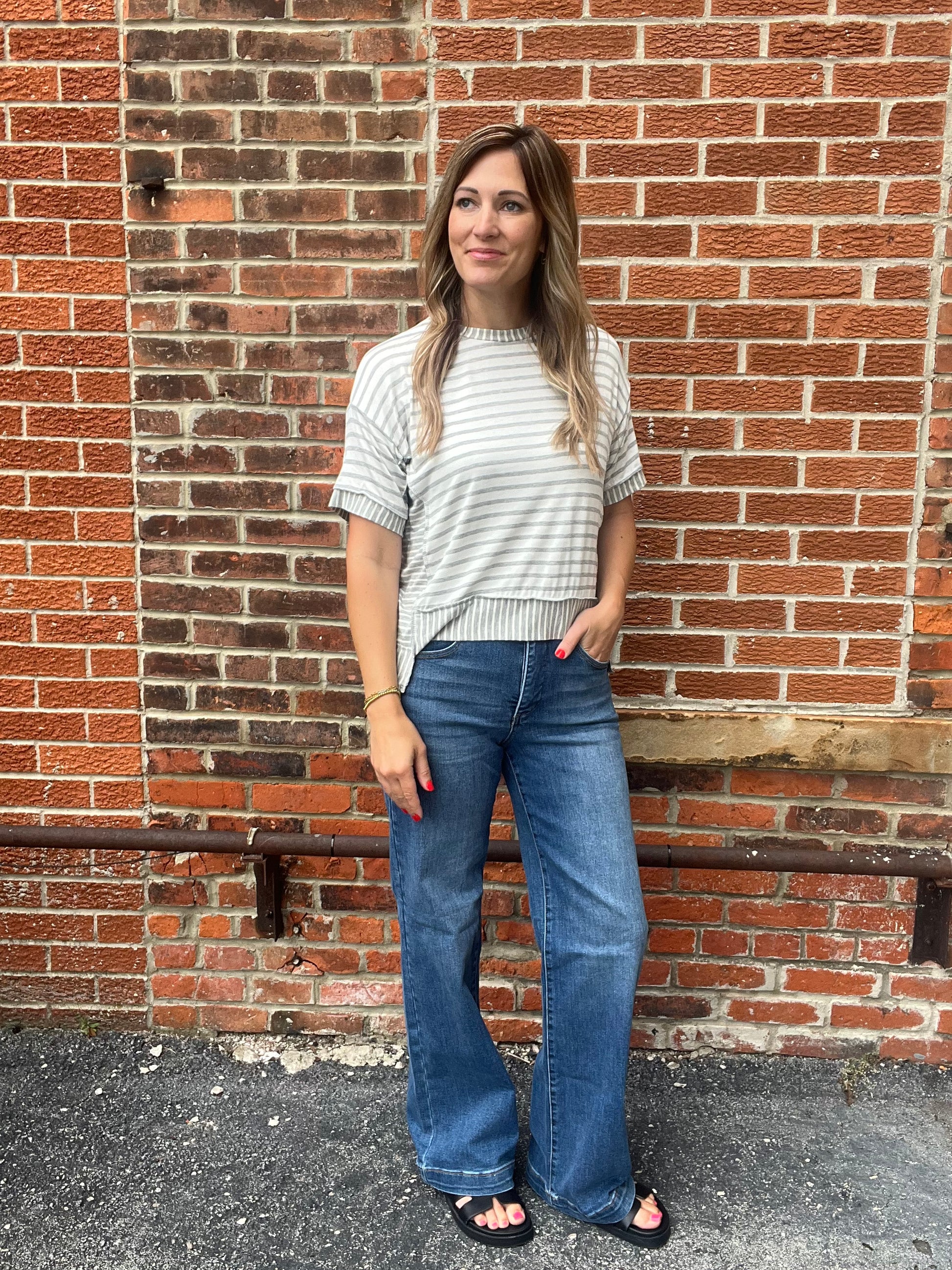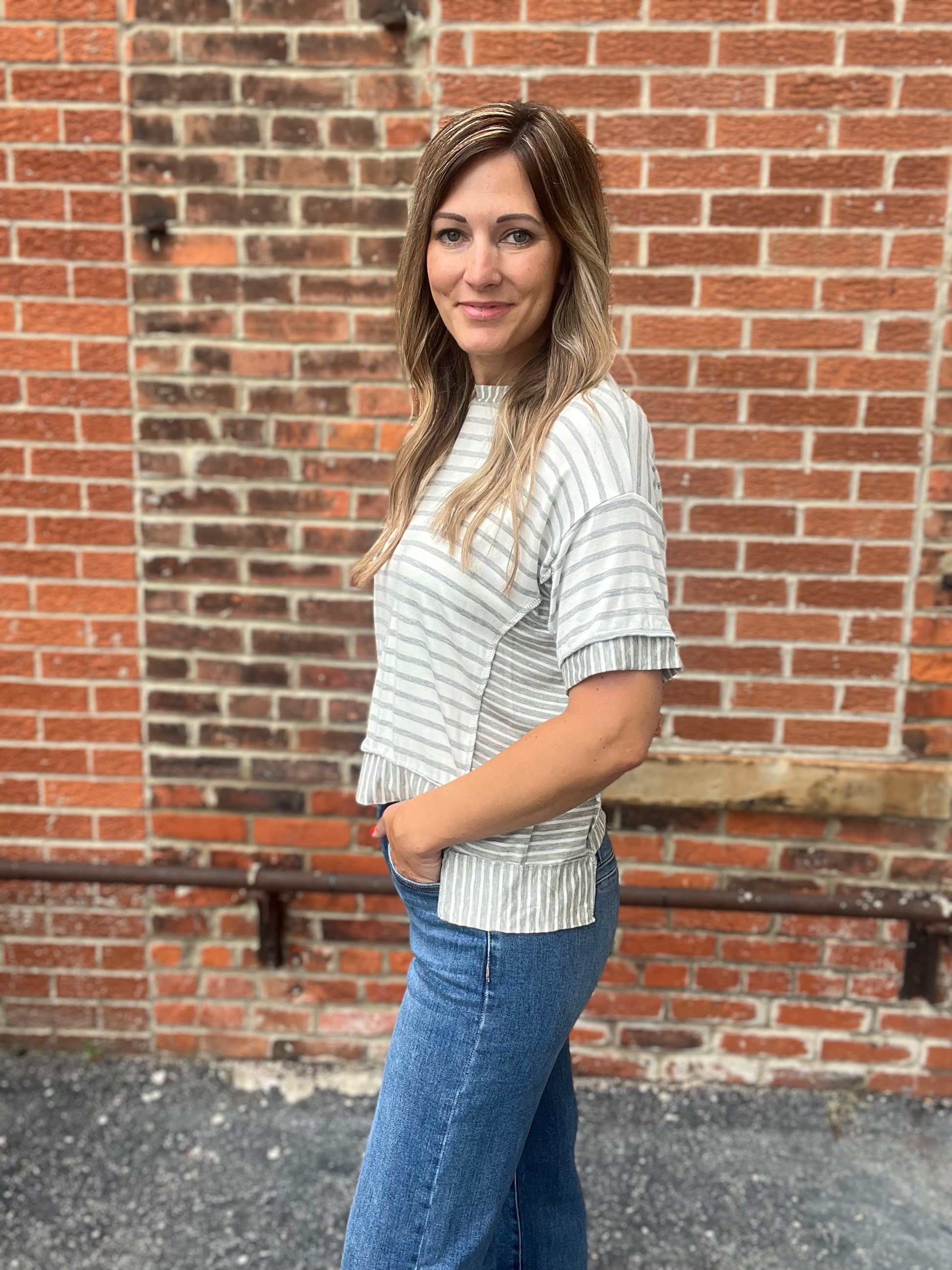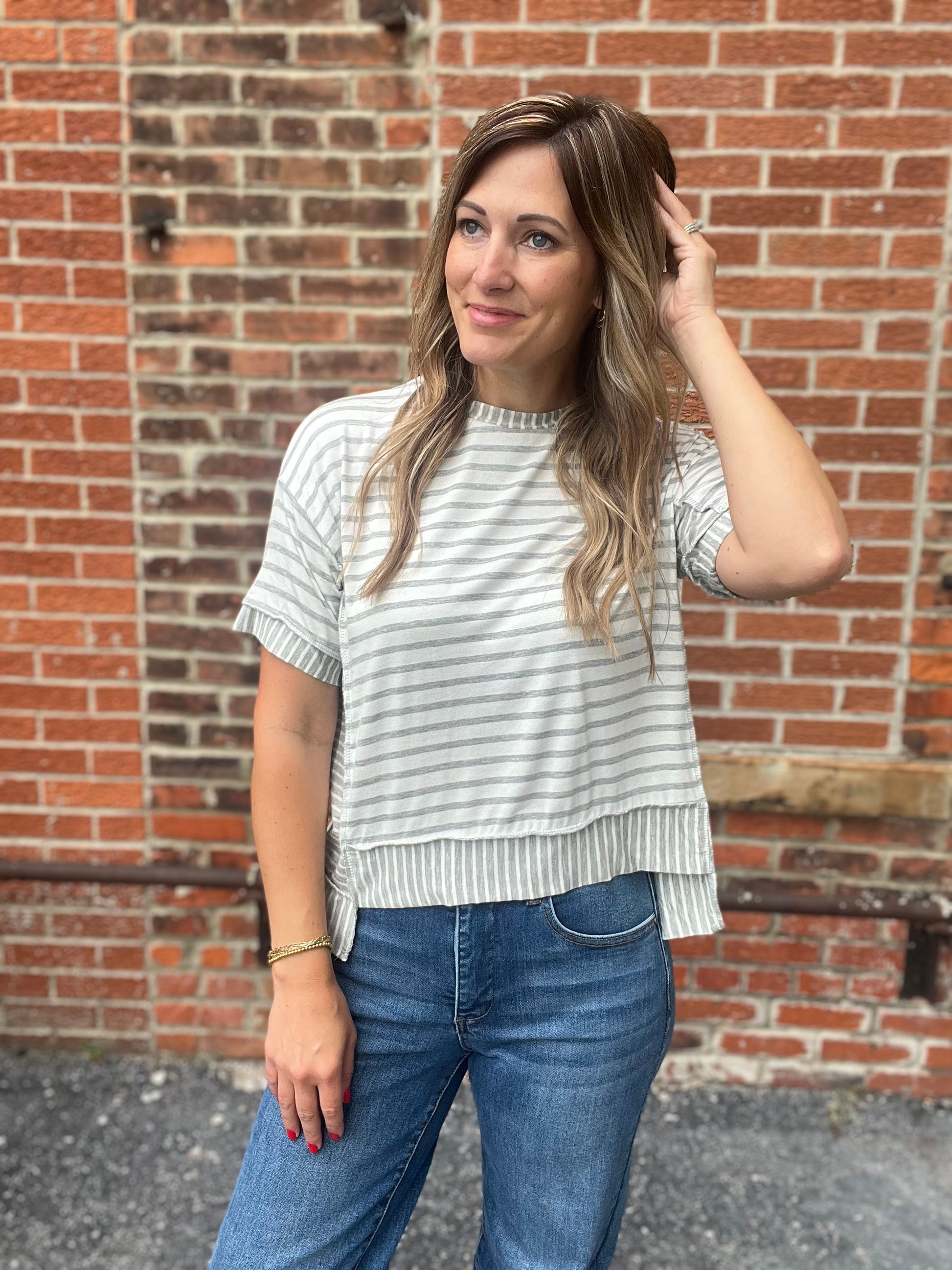 This is a round neck, short sleeve knit top featuring a yarn dyed stripe and color block design. The loose fit and oversized silhouette offer a relaxed, comfortable feel, perfect for casual wear. Made with soft knit fabric, it drapes effortlessly and adds a cozy, laid back vibe. The combination of stripes adds visual interest and a playful touch to this effortlessly stylish piece.