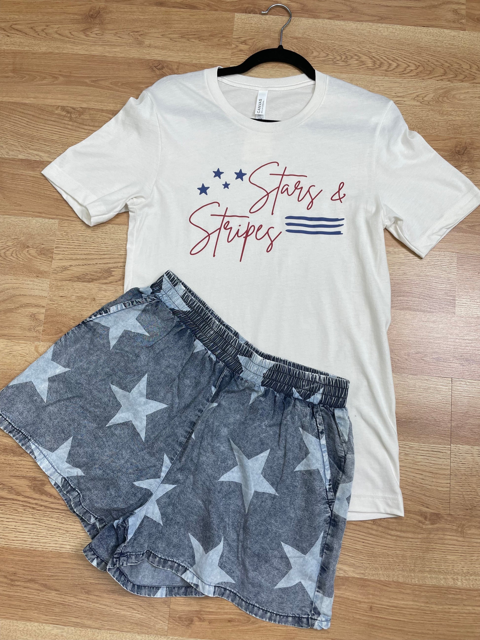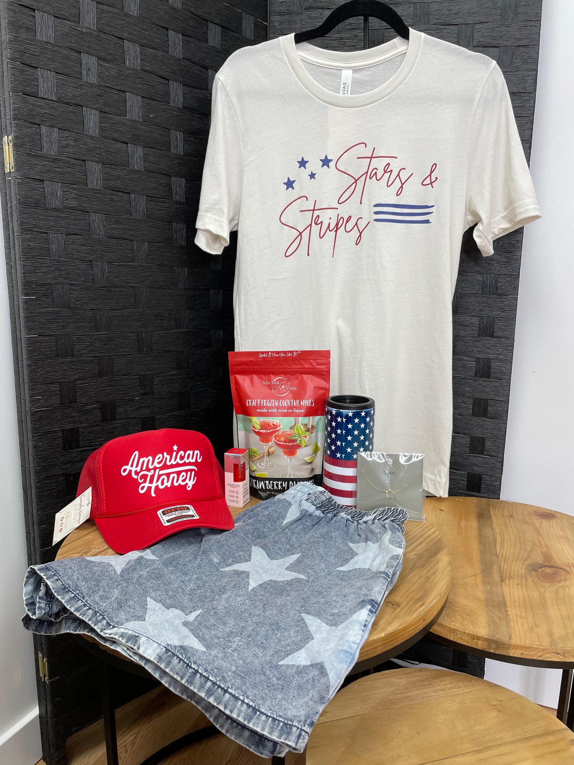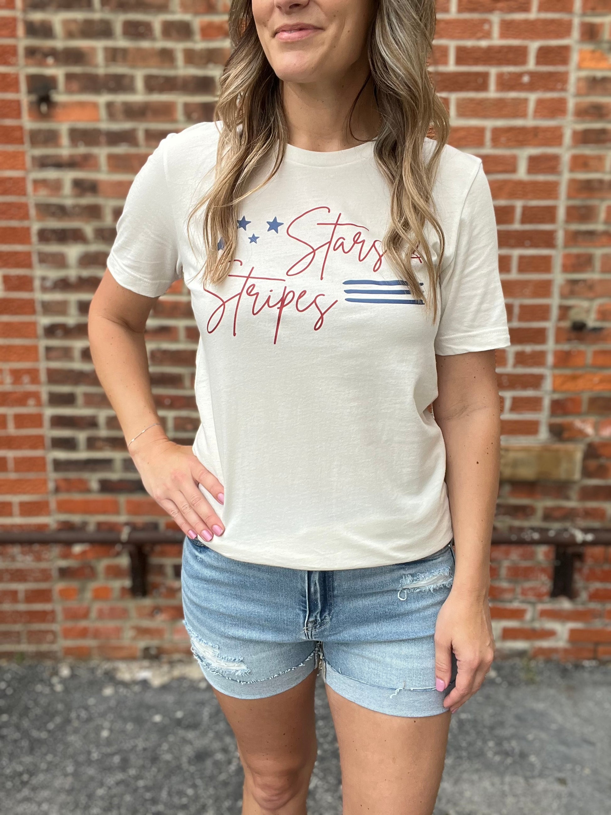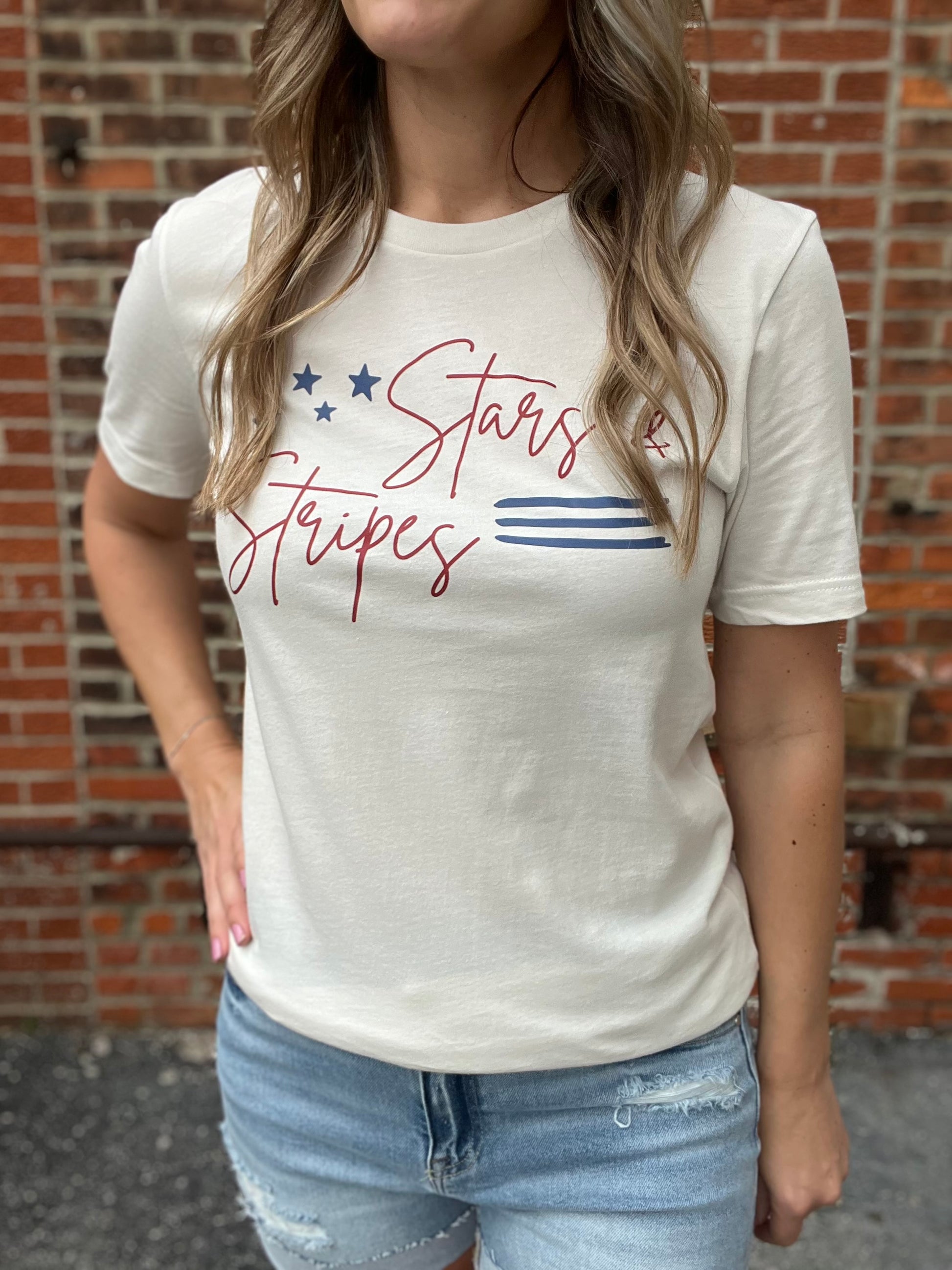 This tee shirt features the phrase “Stars and Stripes” boldly printed across the chest in bright red lettering. Then, a graphic design showcases blue stars and stripes, echoing the American flag motif. The contrasting red and blue elements create a patriotic and eye catching look.