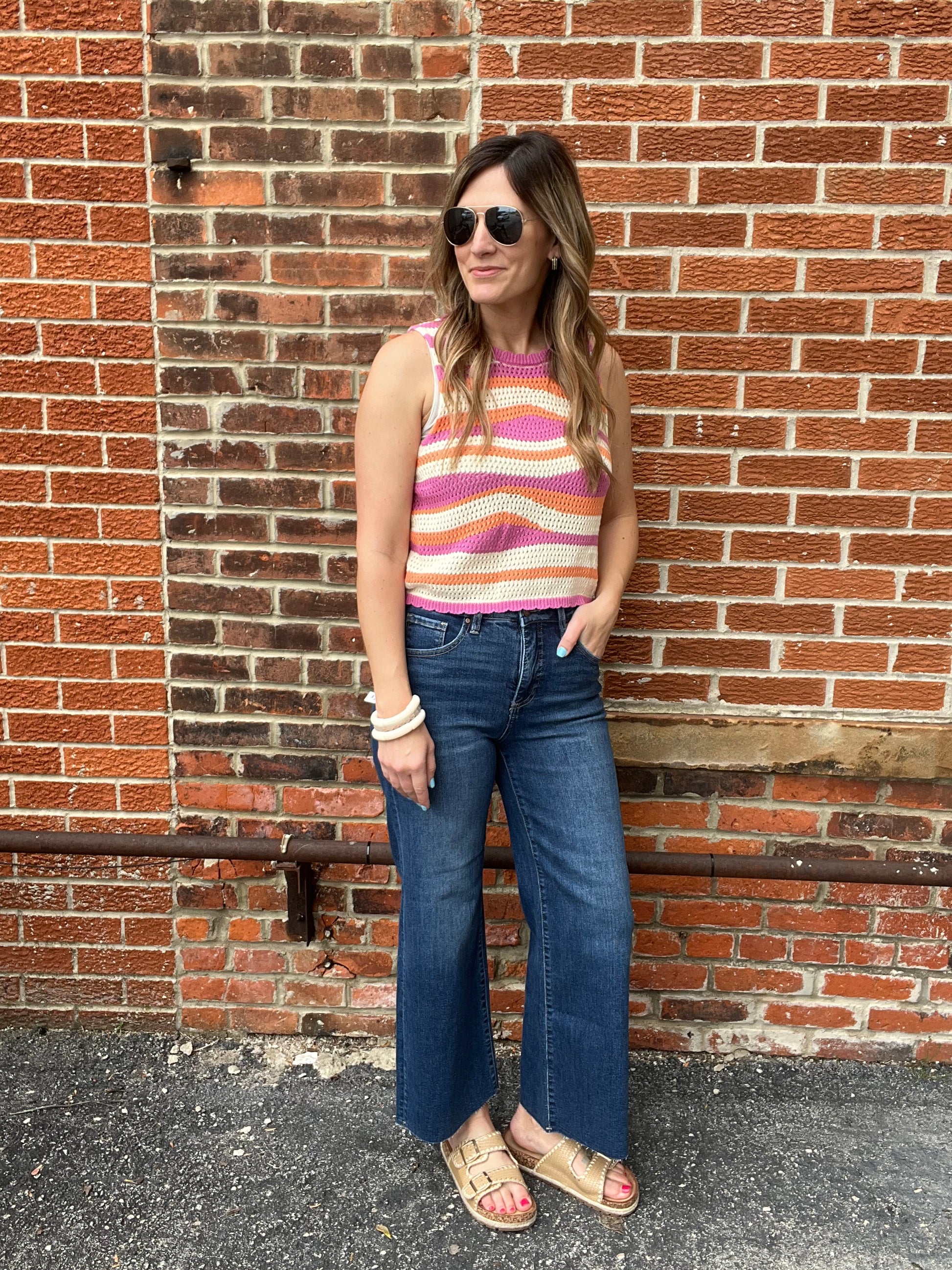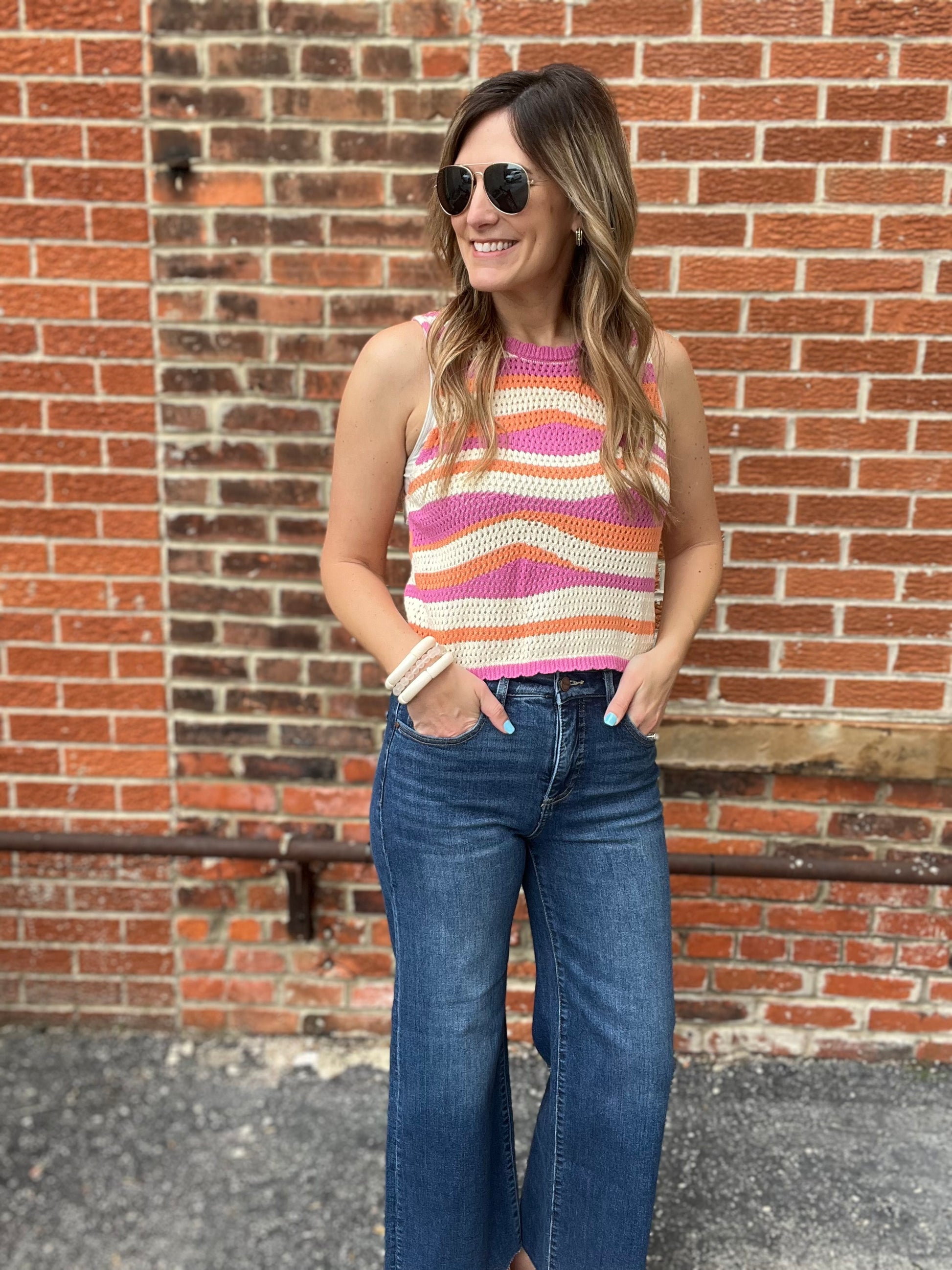 This is a crochet style sleeveless knit top with a wavy stripe pattern. The colors include pink, orange, and off white. The top has a slightly ruffled neckline and armholes, giving it a soft, feminine touch. The open-knit design makes it breathable and perfect for warm weather. The pattern has a retro, 70s-inspired vibe, making it great for a casual, boho, or festival look. The label reads “New Day.”