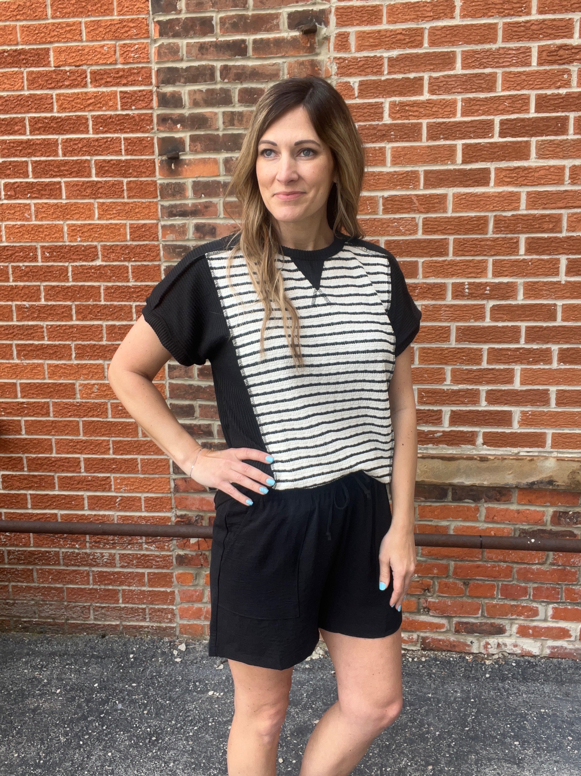 Elevate your everyday style with this cream and black striped top featuring a textured stripe design that adds dimension and flair. The contrast ribbed side panels create a flattering silhouette, while the drop shoulder short sleeves offer a relaxed, effortless vibe. Soft and stylish, this top is perfect for pairing with jeans, shorts, or your favorite black skinnies.