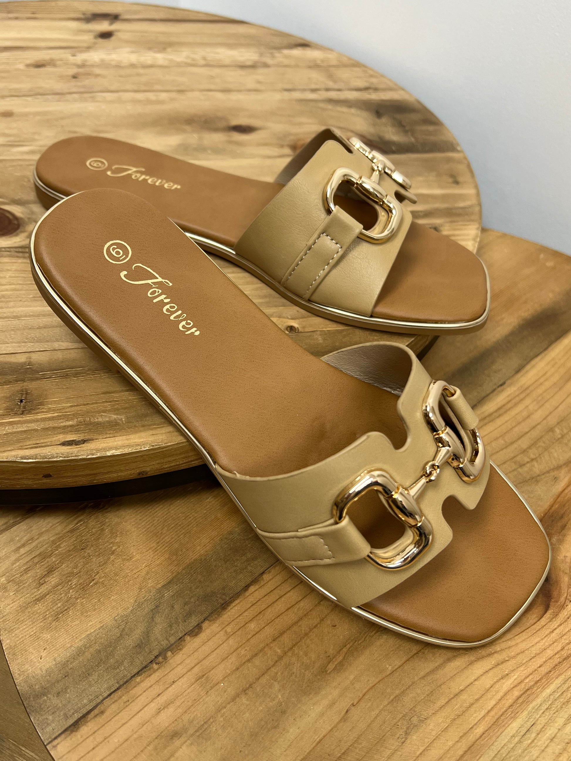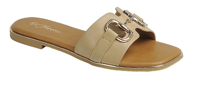 Effortless style meets everyday comfort with this flat slip on sandal. Designed with a modern square toe, sleek gold trim detail, and a chic gold accent across the strap, this sandal adds just the right touch of shine to any outfit. The easy slide on style makes them perfect for everything from casual days to dressed-up summer looks.