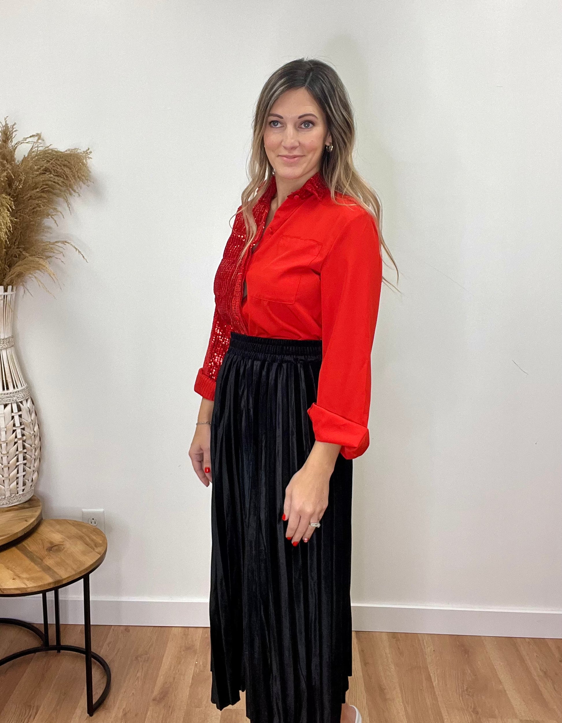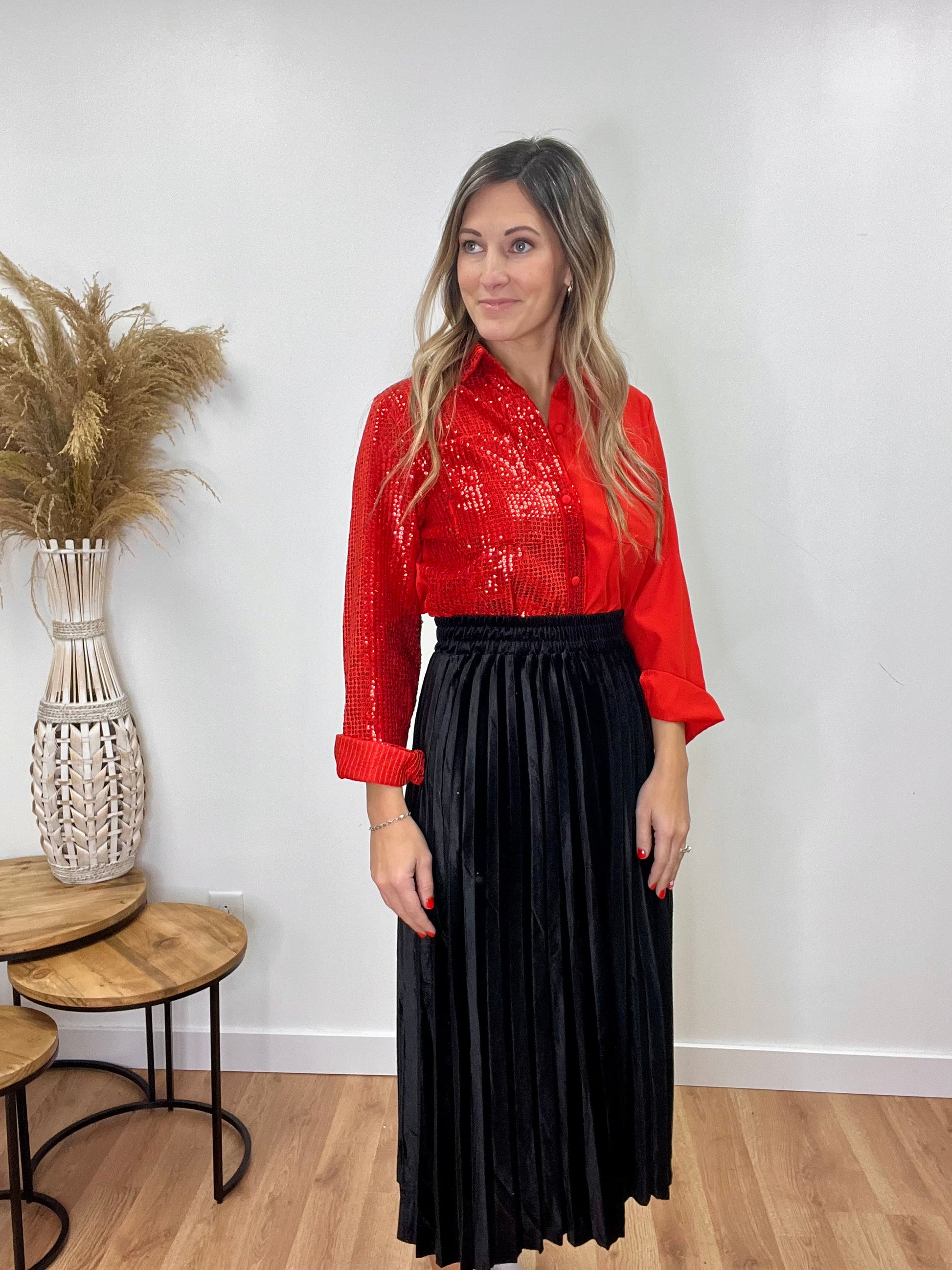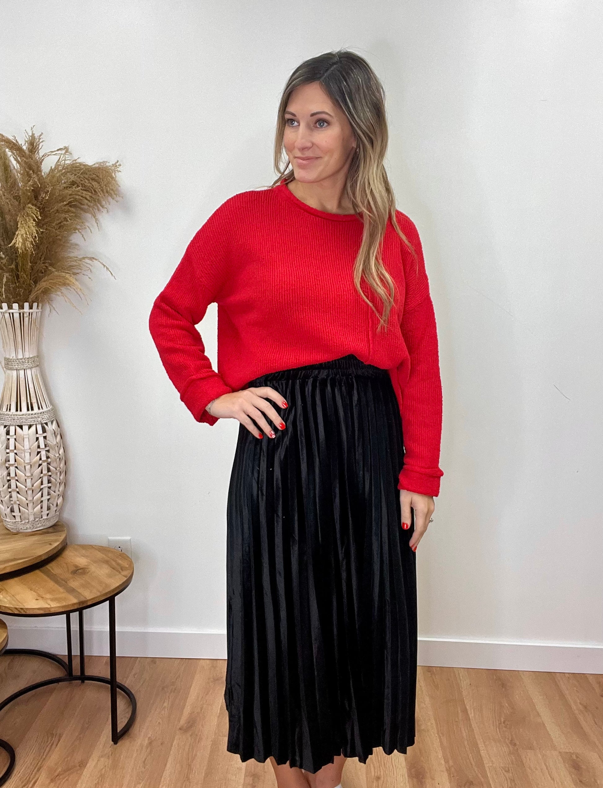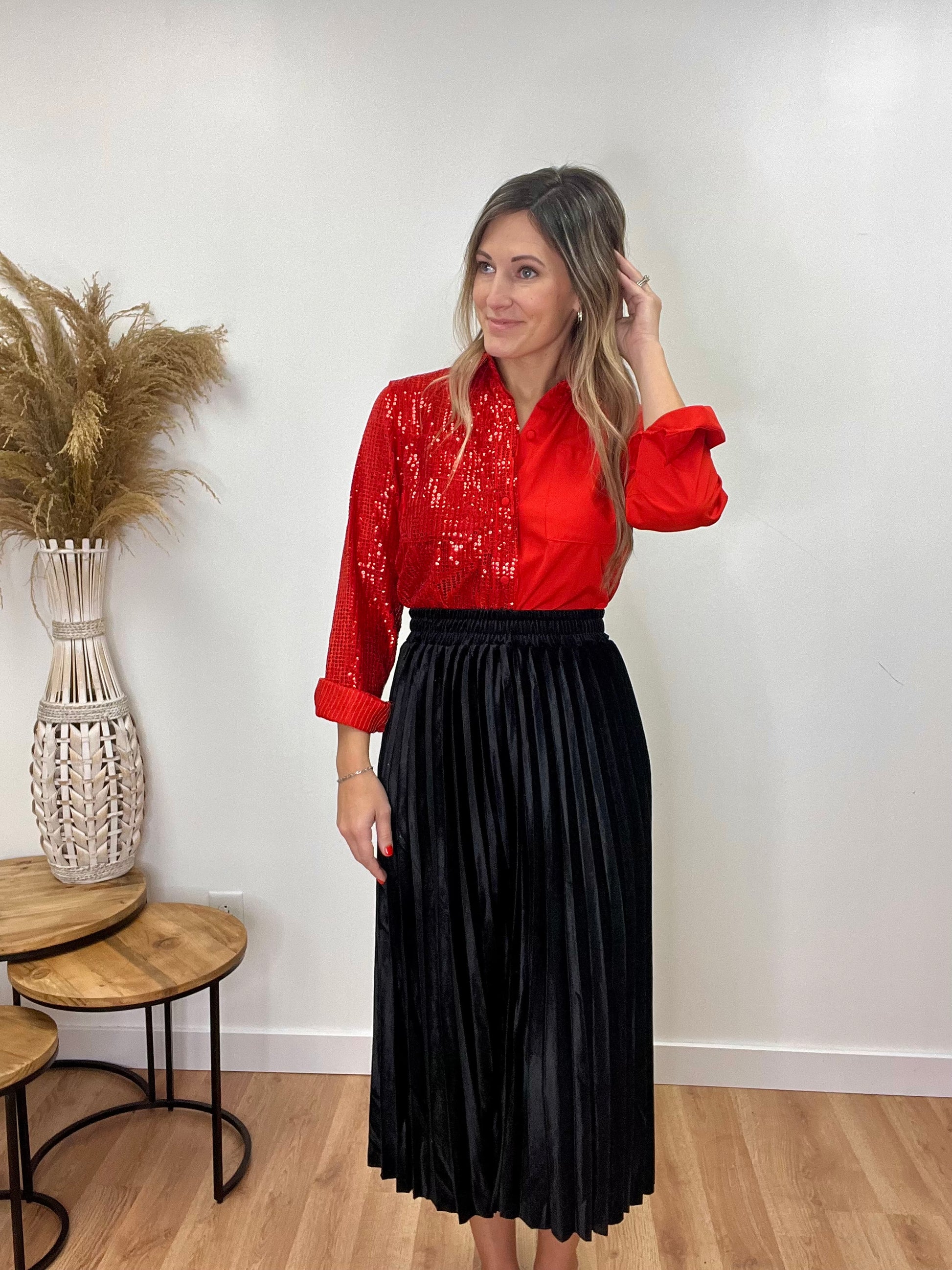 This velvet pleated skirt blends elegance and ease with its luxurious texture and graceful pleats. Designed with an elastic waistband for a comfortable and flexible fit, it’s perfect for adding a touch of sophistication to your day-to-night wardrobe.