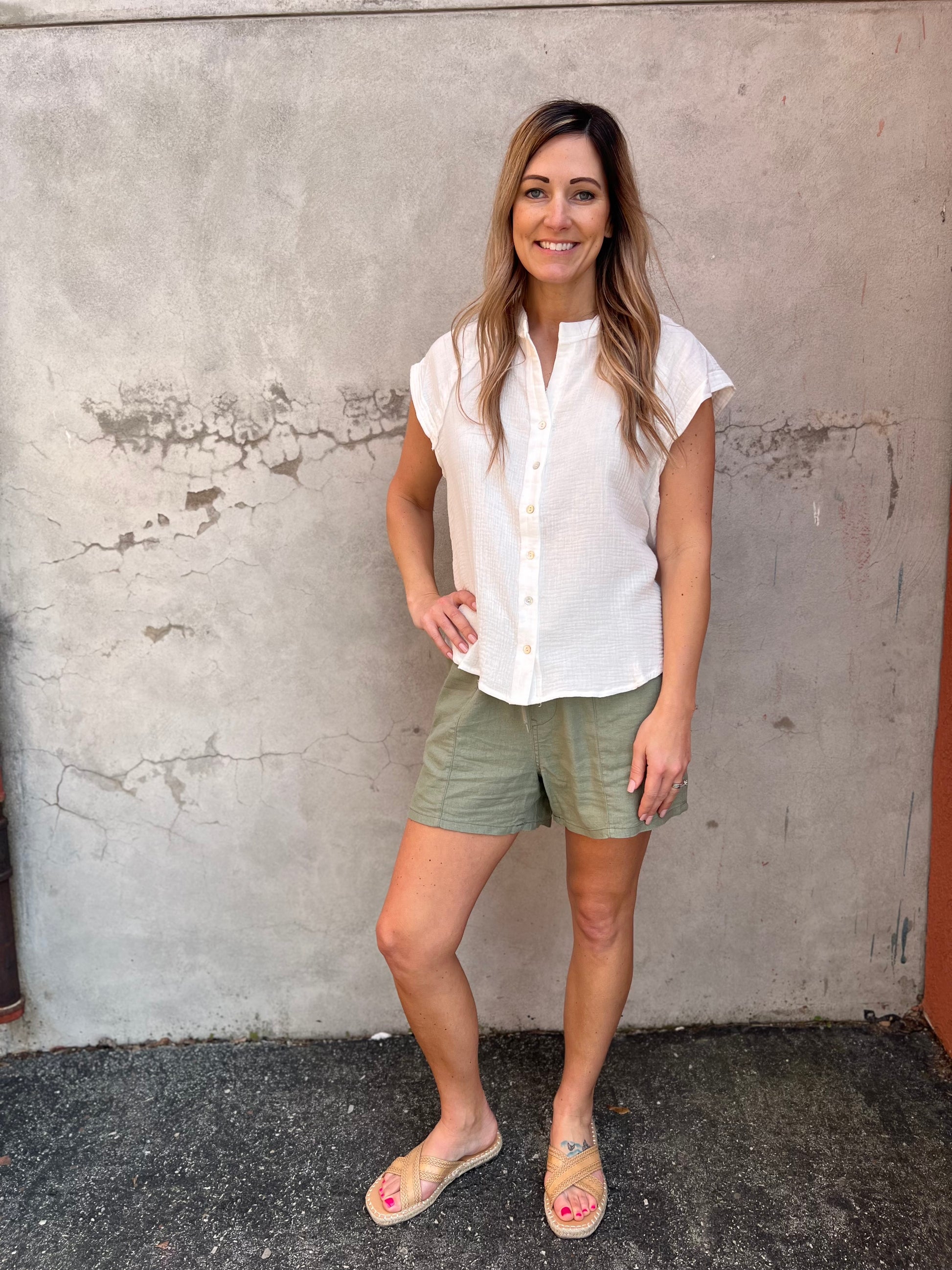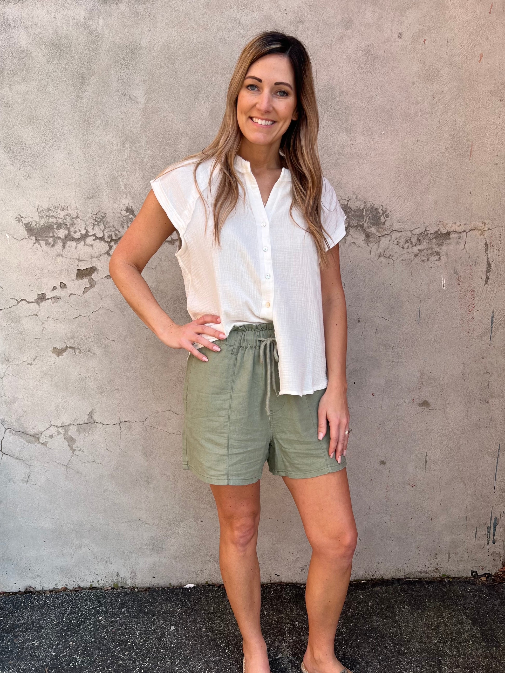 Olive Colored High Rise Side Stem Hem Shorts. Has A Cinched Waist, A Tie Waistband, And Two Side PocketsĀ