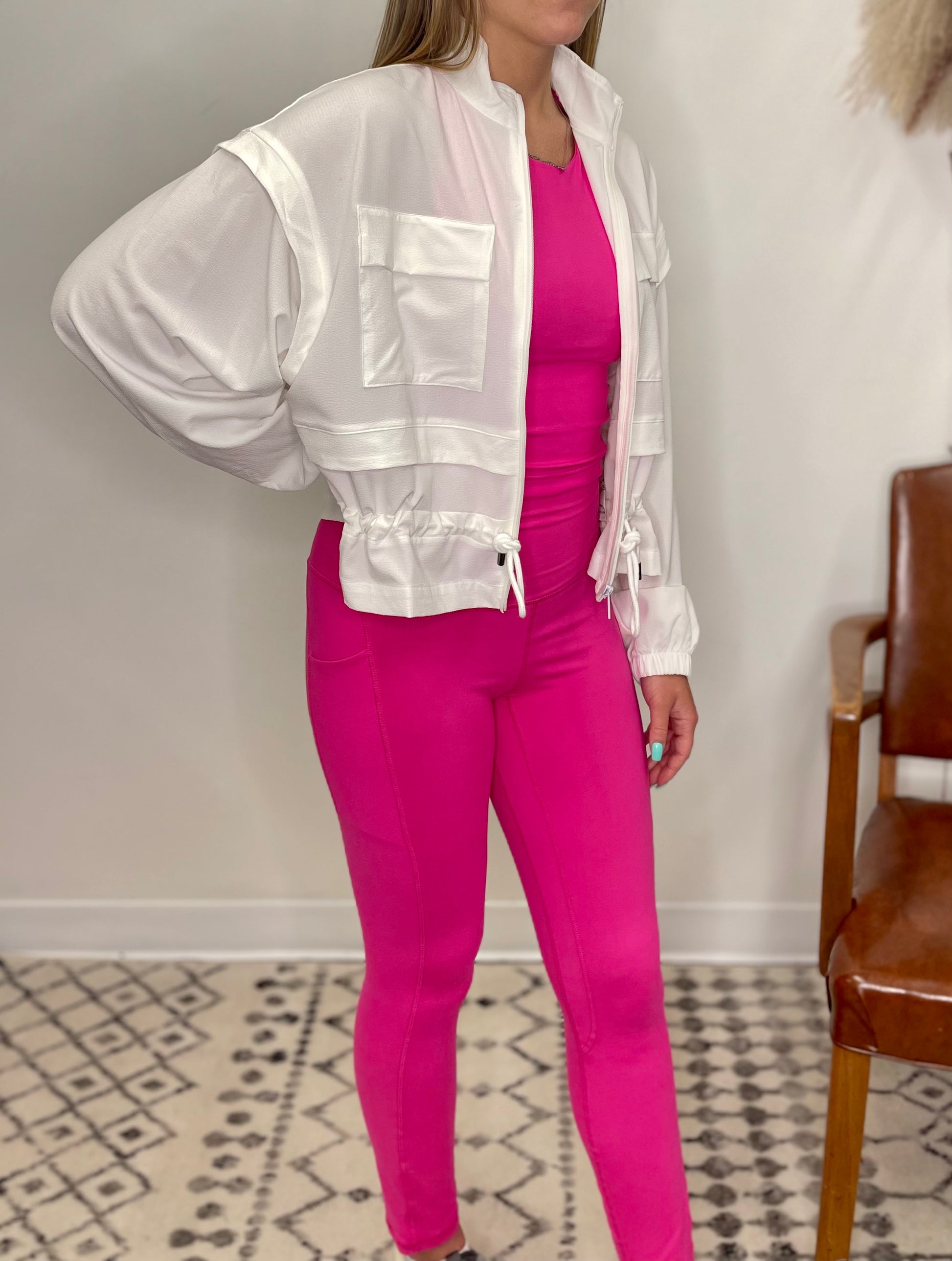 Women’s Rae Mode Off White Crinkle Crop Jacket. This Kringle Crop Jacket is the Perfect Way to Be Stylish and Comfortable this Season. Made From a Lightweight Crinkle Fabric. This Jacket is Designed to Keep You Warm Without Feeling Heavy. This Jacket Has A Cinched Waist Detail And Chest Pocket. This Will Be Your Favorite Layering Piece This Season.