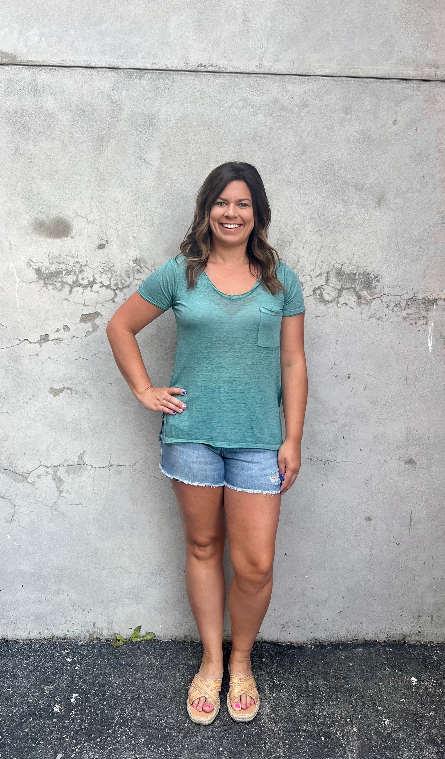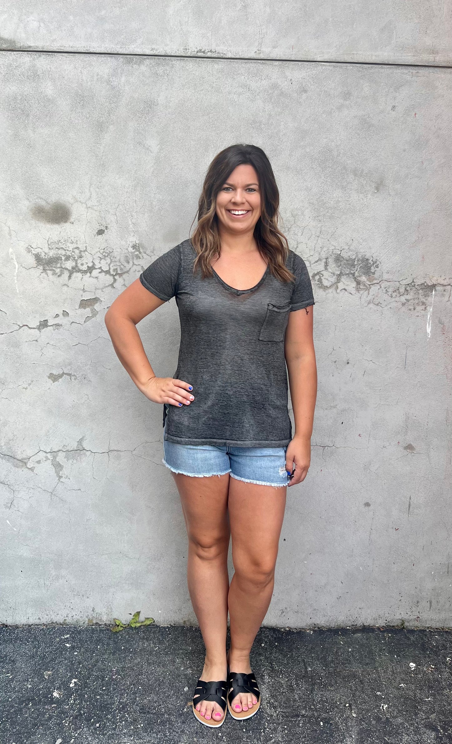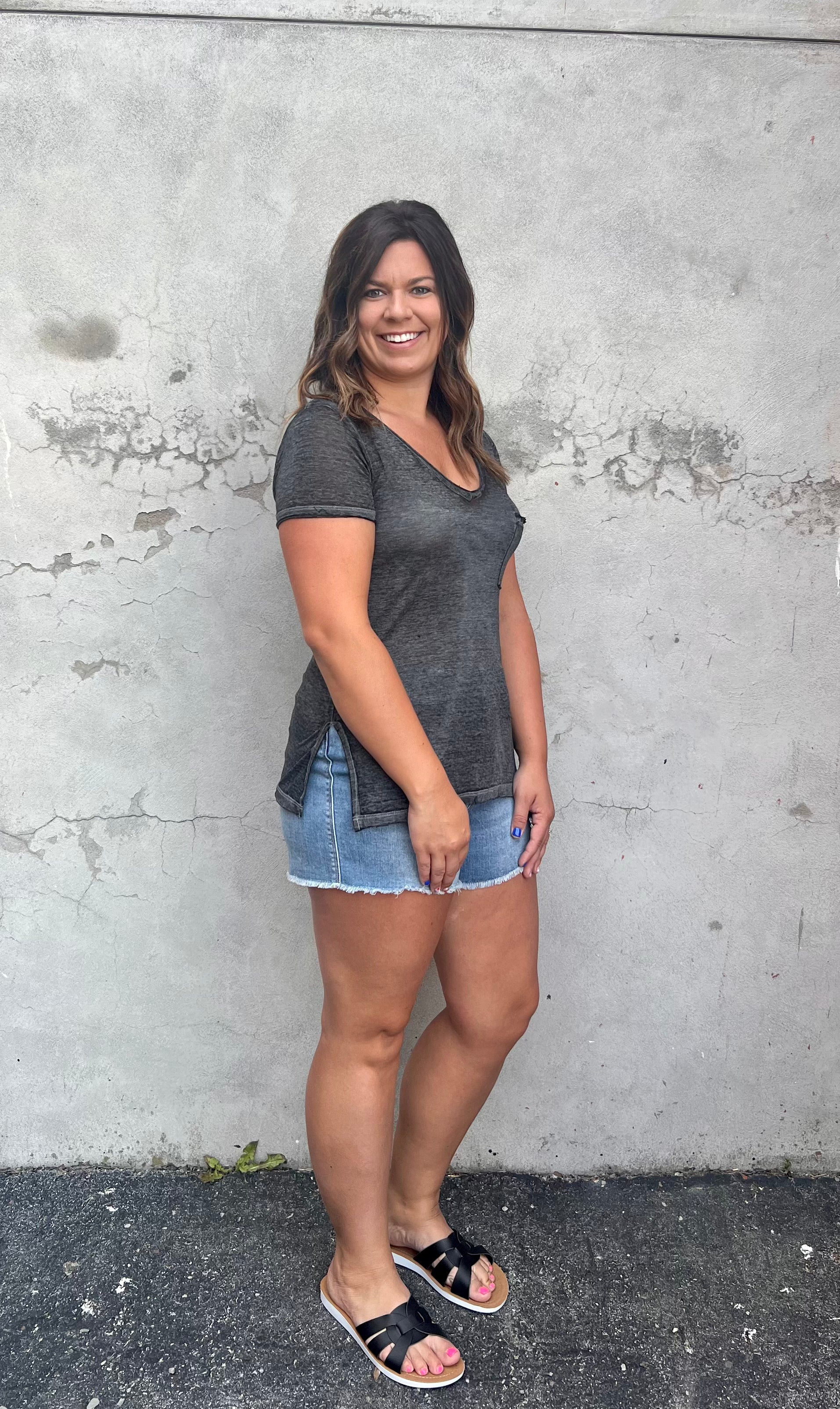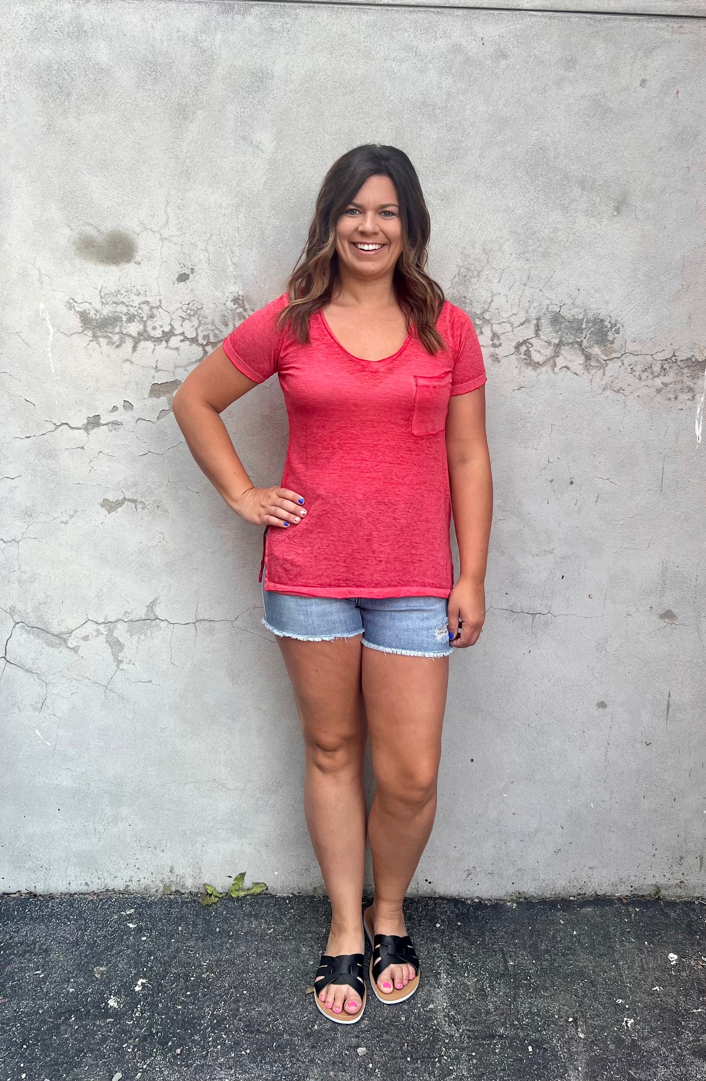 A Washed Burn Out V Neck Top With Pocket, A Slide Slit And Raw Edge Detail