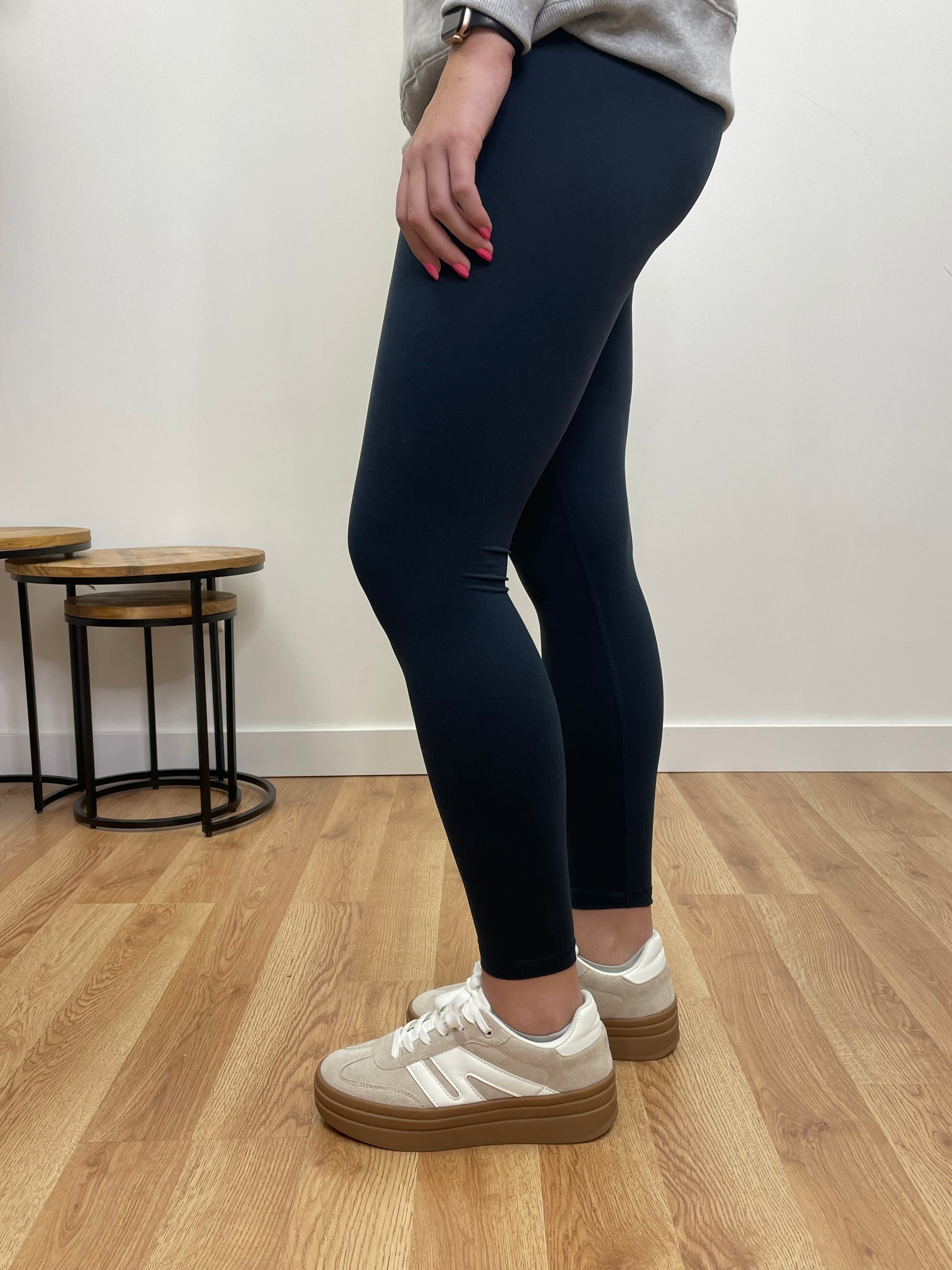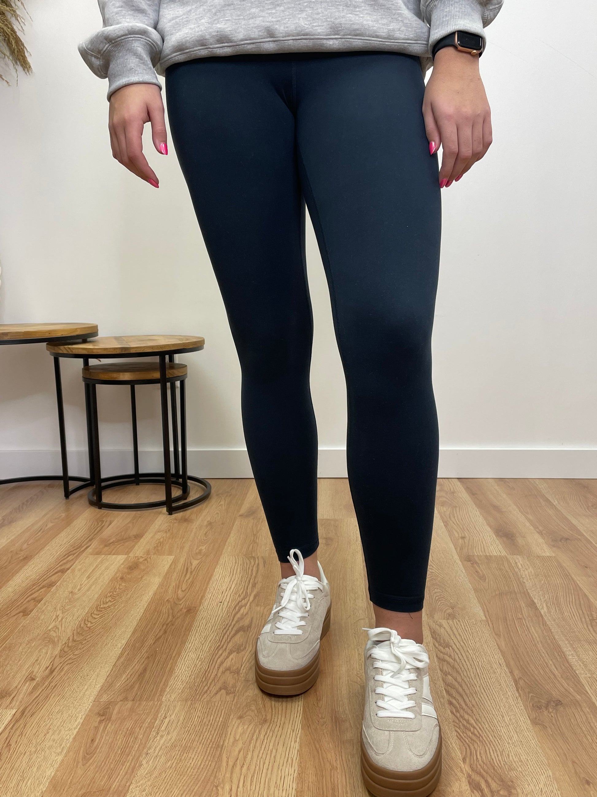These navy leggings offer a cozy, structured fit with just a hint of stretch for comfortable wear. Made from a soft, warm fabric, they provide a snug feel that keeps you comfortable while maintaining their shape. Perfect for casual days or layering with your favorite sweaters, these leggings blend style and comfort effortlessly.