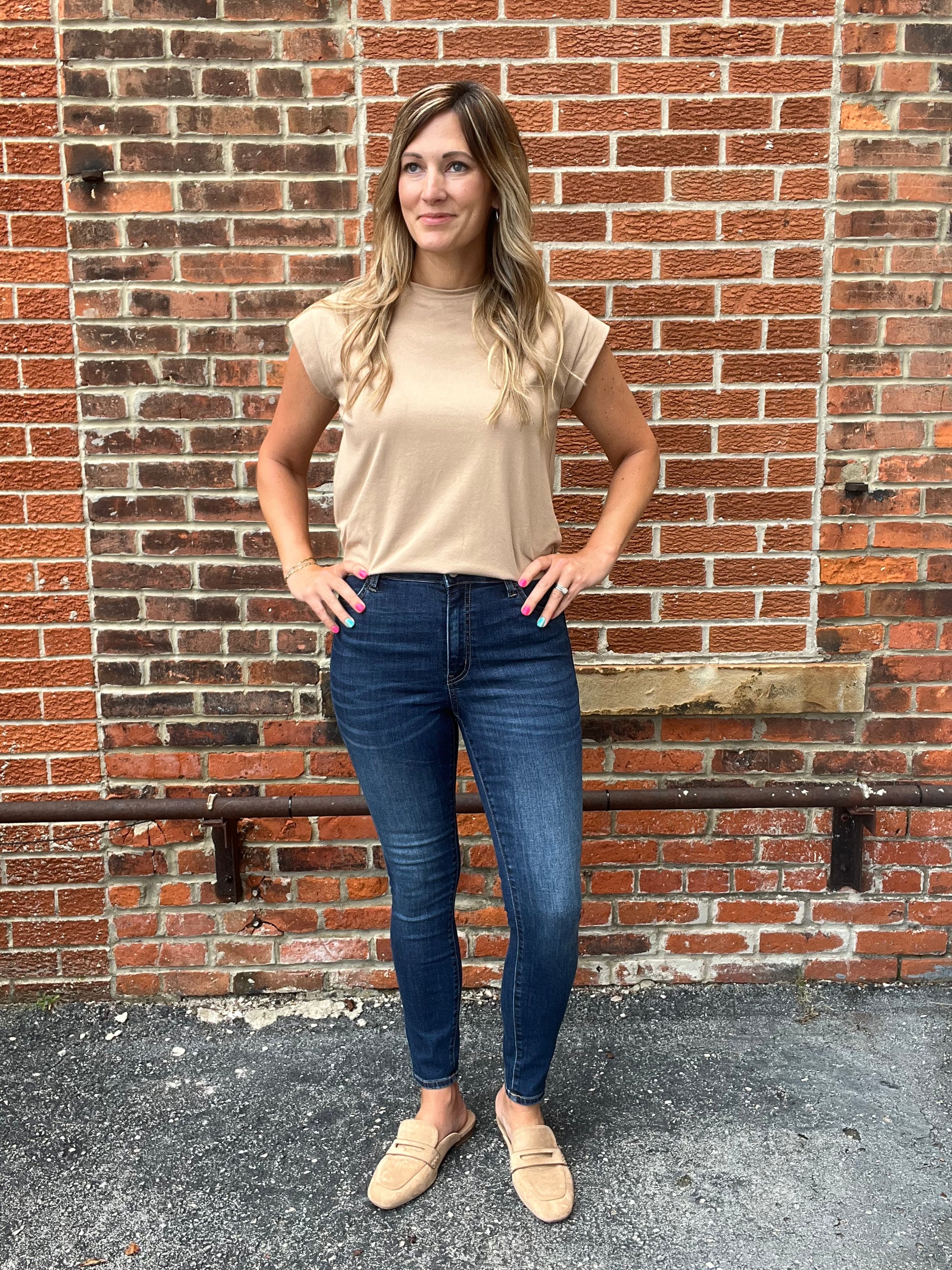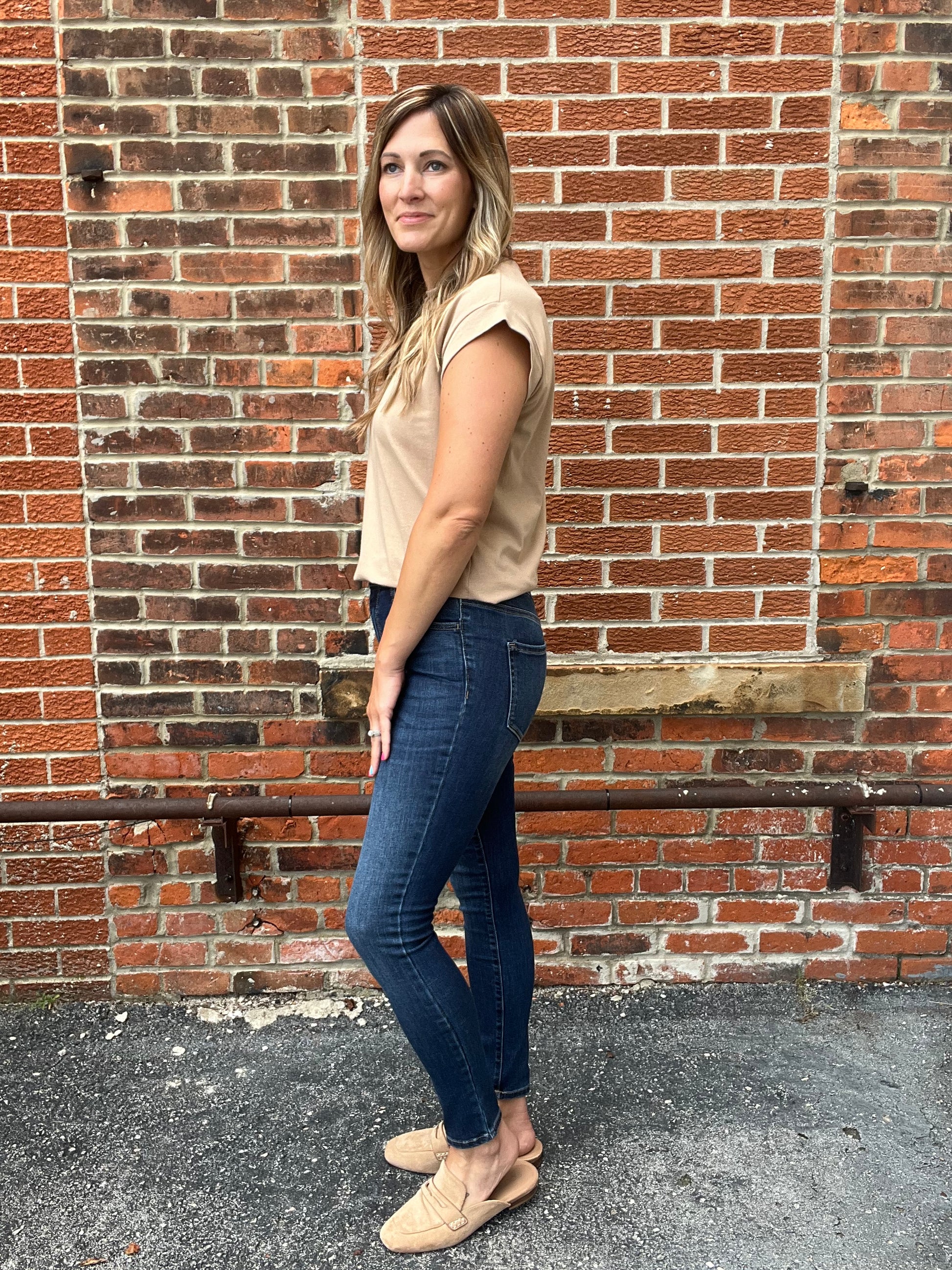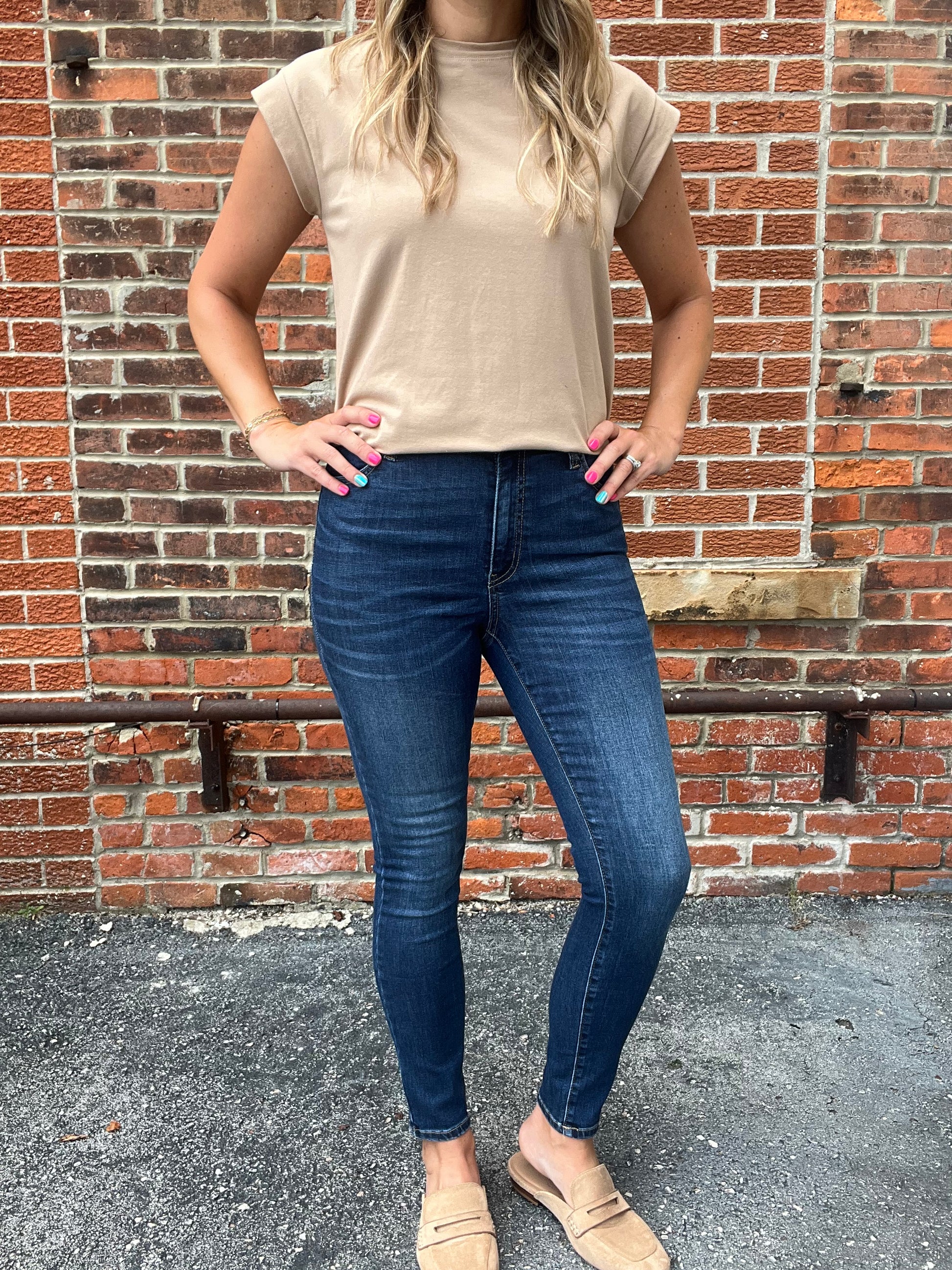 These high rise dark skinny jeans offer a sleek, flattering silhouette with a comfortable, figure hugging fit. The rich dark wash adds a polished touch, making them easy to dress up or down. Designed to sit above the waist, they elongate the legs and provide all day comfort with just the right amount of stretch. A versatile wardrobe essential.