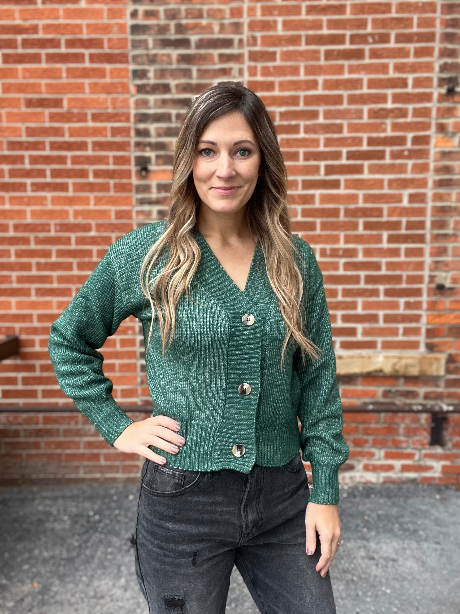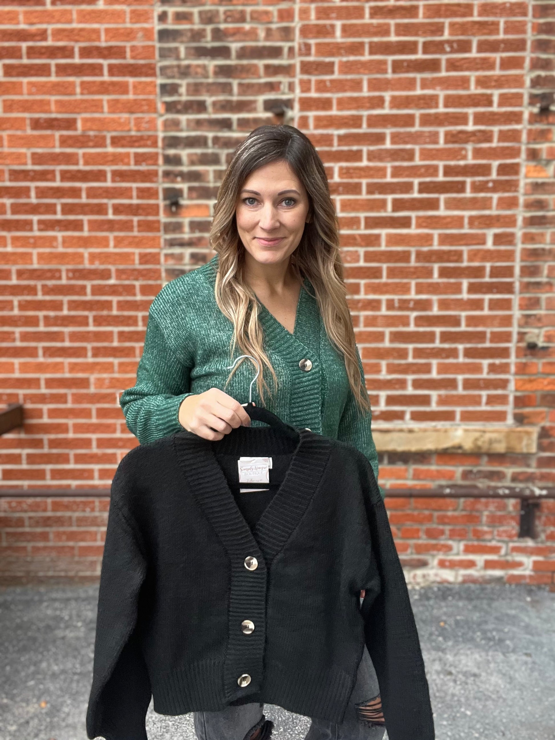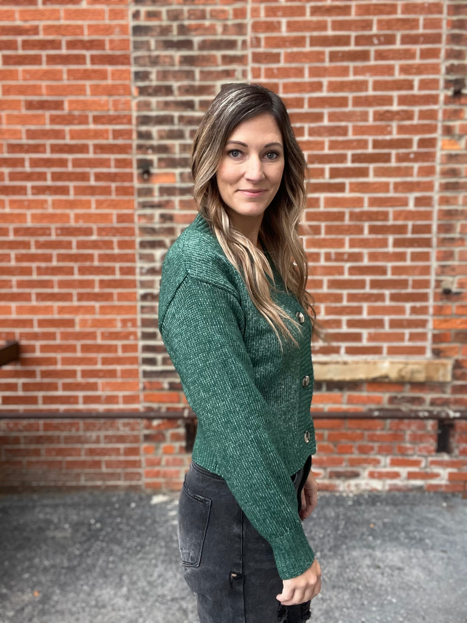 This cozy cropped sweater is crafted from a soft, plush fabric for ultimate comfort. It features a stylish, slightly loose fit that flatters all shapes. The sweater is designed with a charming three-button detail on the front, adding a touch of vintage-inspired style. Available in classic black and a rich green, it’s perfect for pairing with high-waisted jeans, skirts, or layering over dresses for an effortlessly chic look.
