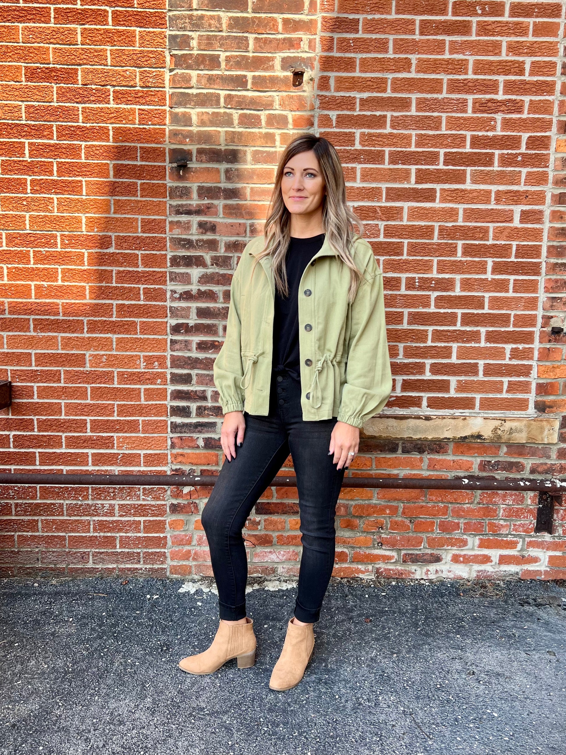 Features: Drawstring Waist To Give A Cinched Look, Tortoise Buttons, Elastic Wrist.