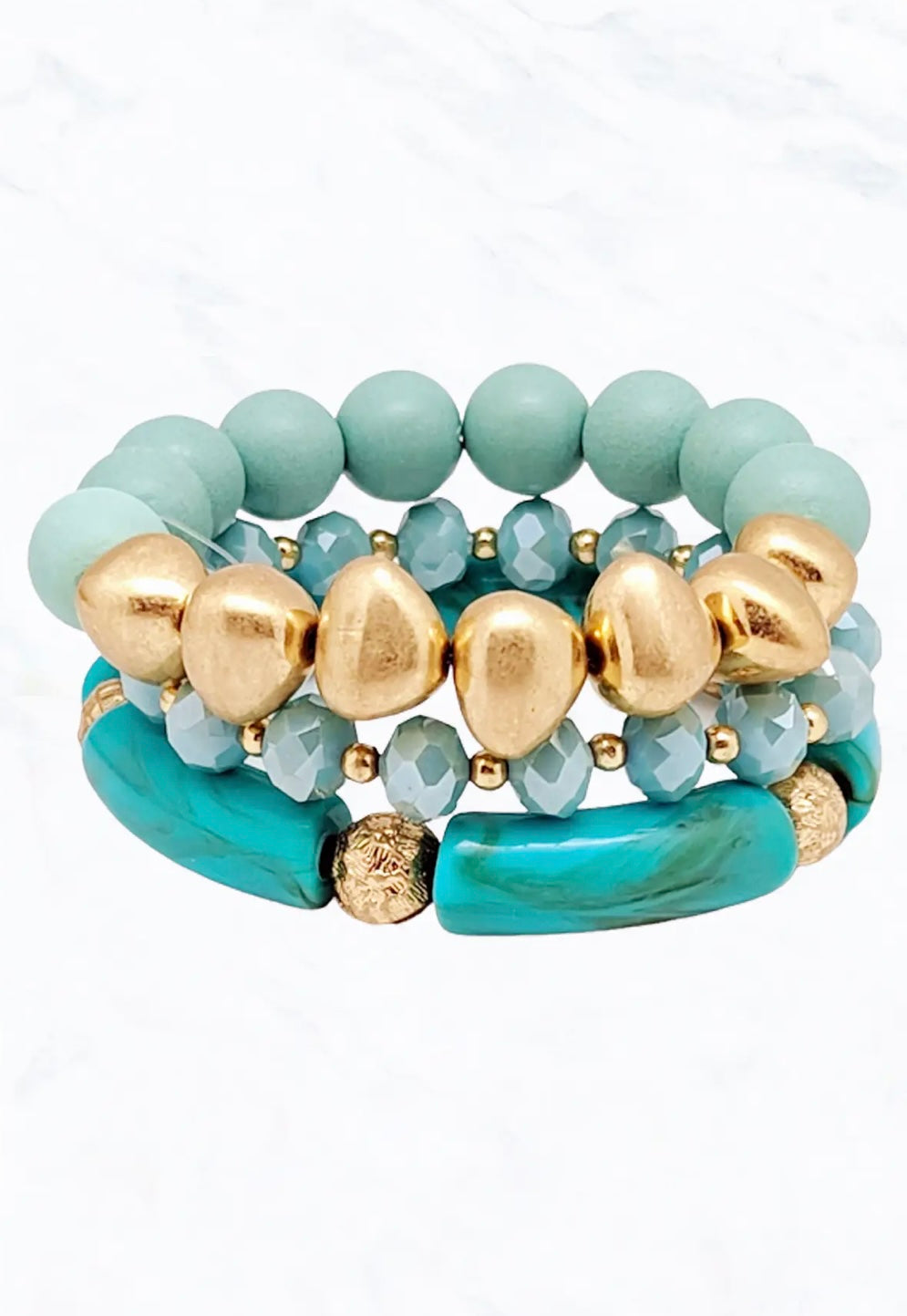 3 Piece Stretch Bracelet Set, Metal/Glass/Wood Beads.