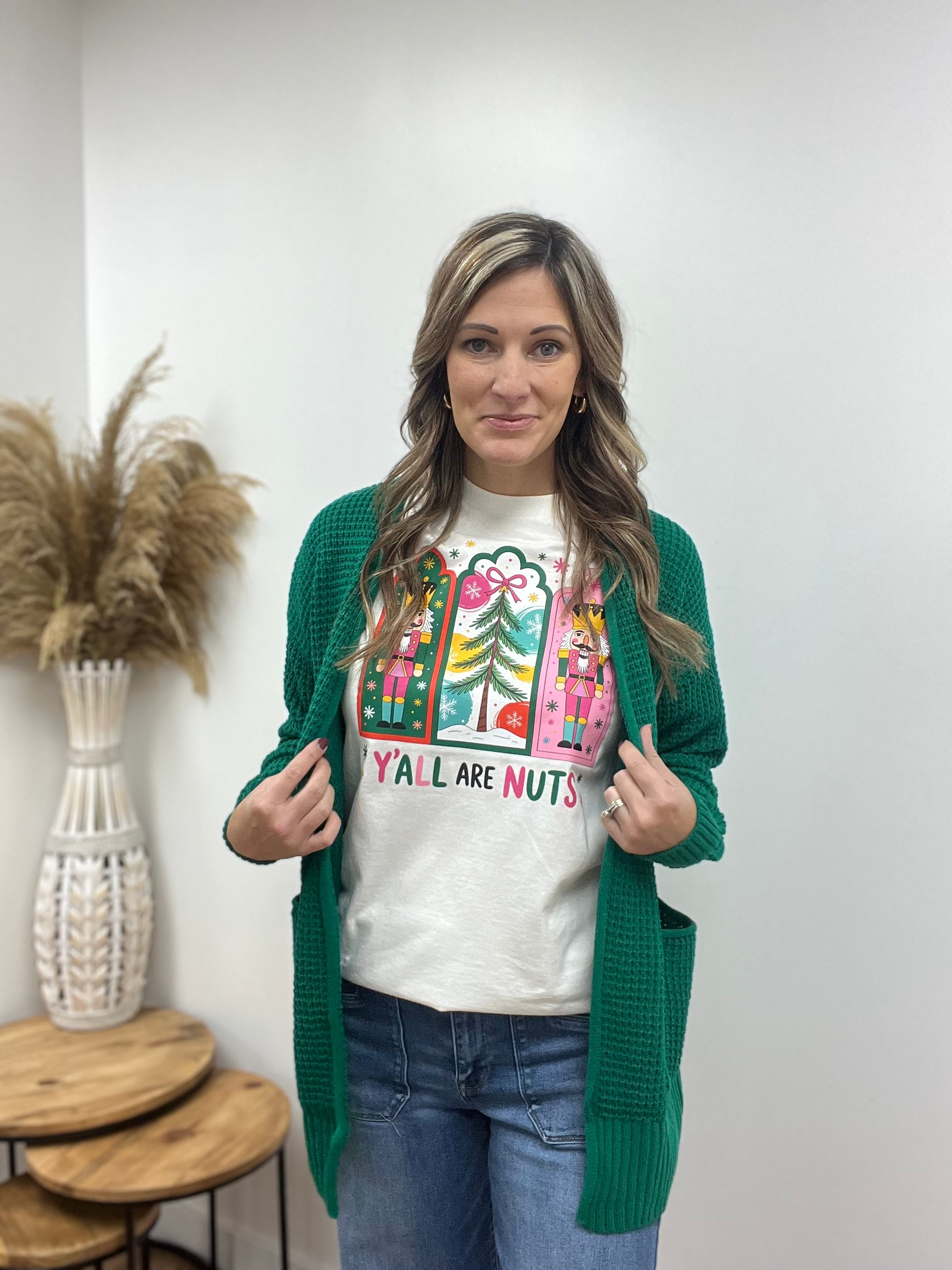 Bring the festive fun with this adorable nutcracker-themed graphic tee! Featuring a cute, whimsical nutcracker and playful holiday vibes, this tee is perfect for spreading cheer all season long.
